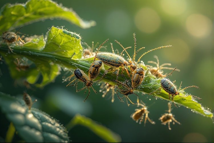 • Soft-bodied insects clustered on stems and undersides of leaves